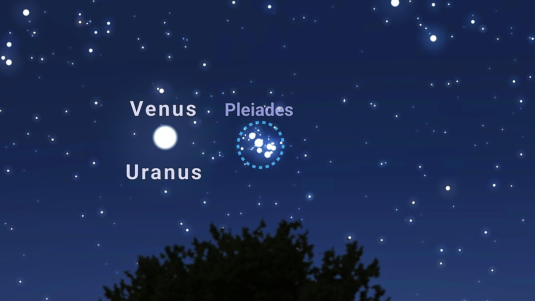When observing Venus these coming days, as she has now risen far enough in the evening sky (about 27degrees from the Sun) to be easily seen just after dusk, and with a still not too bright Moon, the Pleiades should also be well visible. Though Uranus cannot be seen with the naked eye, you can imagine the presence of Uranus there with Venus.